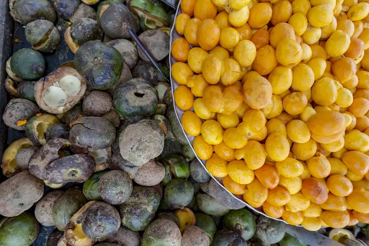 Com seu aroma inconfundível e sabor intenso, o pequi (Caryocar brasiliense) cresce em árvores nativas do cerrado e é colhido entre os meses de outubro e fevereiro, enchendo feiras e cozinhas goianas com seu tom amarelo vibrante. Mas atenção: quem conhece sabe que comer pequi exige cuidado — sua polpa esconde espinhos finíssimos que podem machucar se mastigados incorretamente.